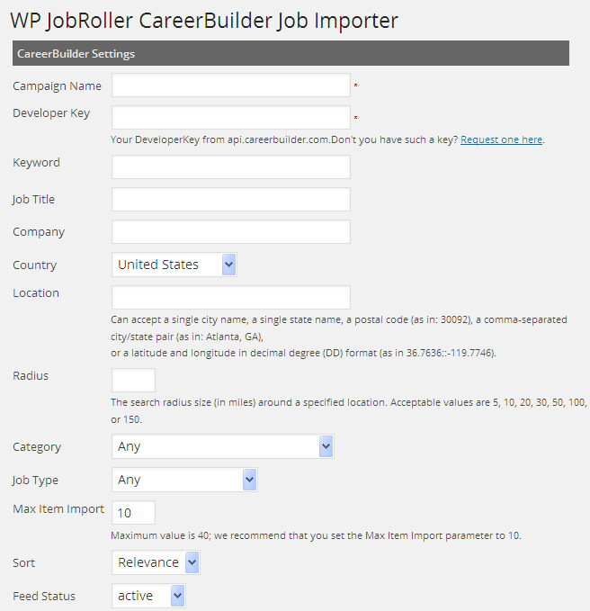 - DeveloperKey : Your DeveloperKey from api.careerbuilder.com. Don’t you have such a key? Request one here.