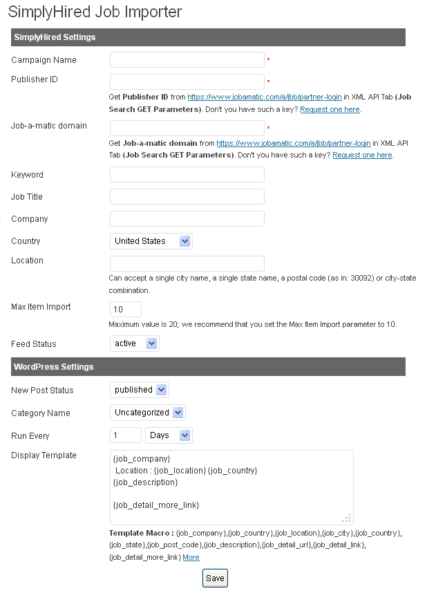 - Category NameList of Categories from WordPress Blog. The SimplyHired job imported from above settings will be inserted in that category